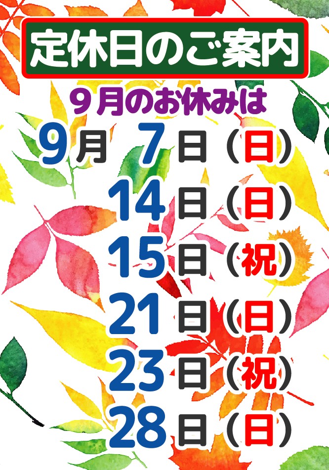 9月定休日のご案内 2025年8月27日 カテゴリー: 未分類 管理者 9月の定休日は7日(日)・14日(日)・15日(祝)・21日(日)・23日(祝)・28日(日)です。 15日の敬老の日と23日の秋分の日はお休みさせていただきます。 よろしくお願い致します。